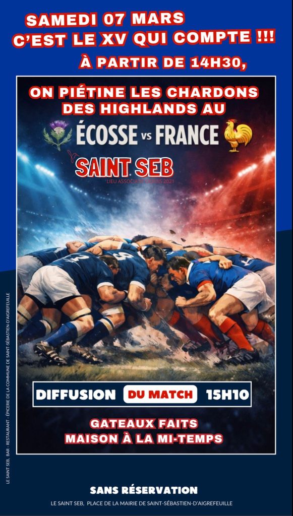 proposé par Le Saint Seb, à partir de 14h30, diffusion du match à 15h10, gâteaux faits maison à la mi-temps